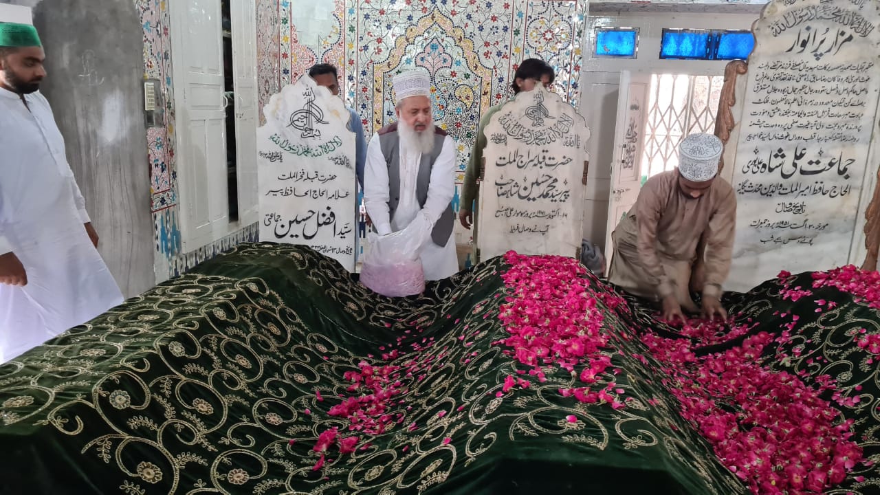 حضرت امیر ملت پیر سید جماعت علی شاہ صاحب محدث علی پوری رحمتہ الله علیہ کے عرس مبارک کے موقع پر سجادہ نشین و جانشین حضرت امیر ملت پیر سید منور حسین شاہ جماعتی صاحب دربار شریف پر غسل پاک کی رسم کے بعد چادر پوشی کرتے ہوئے