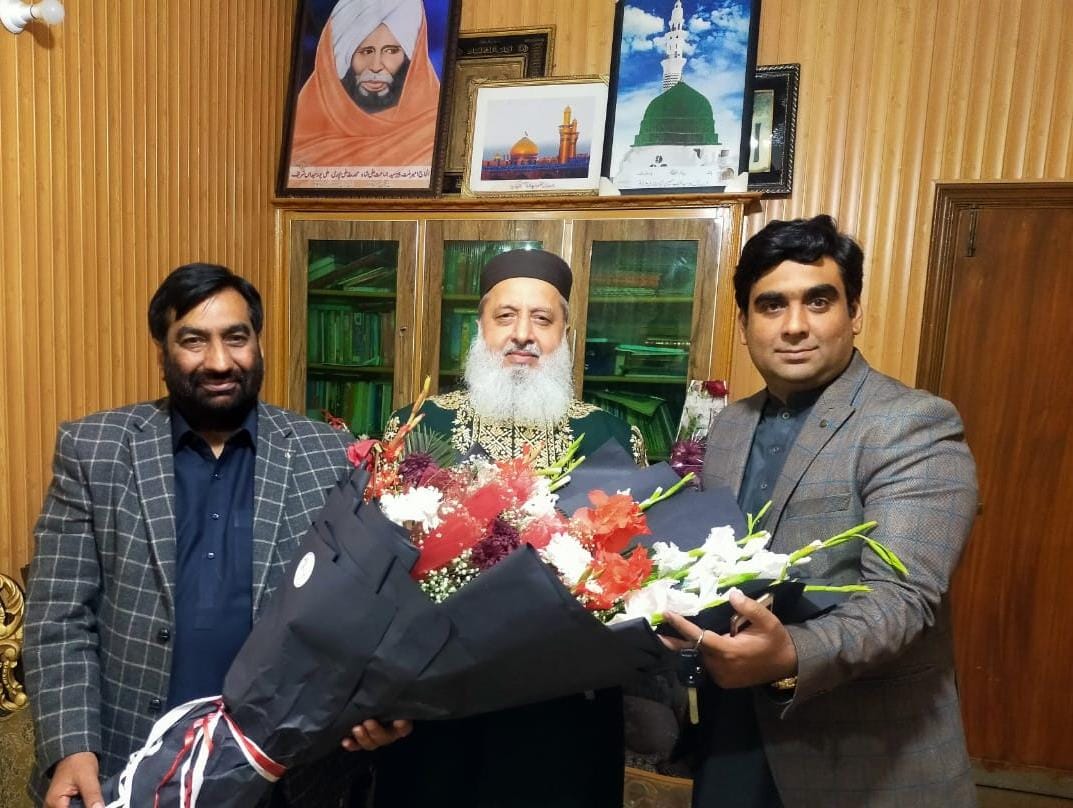 جماعت منزل لاہور میں روزنامہ انصاف کے ایڈیٹر حافظ محمد اقبال صاحب اور ان کے ساتھی سجادہ نشین و جانشین حضرت امیر ملت پیر سید منور حسین شاہ جماعتی صاحب سے ملاقات کرتے ہوئے