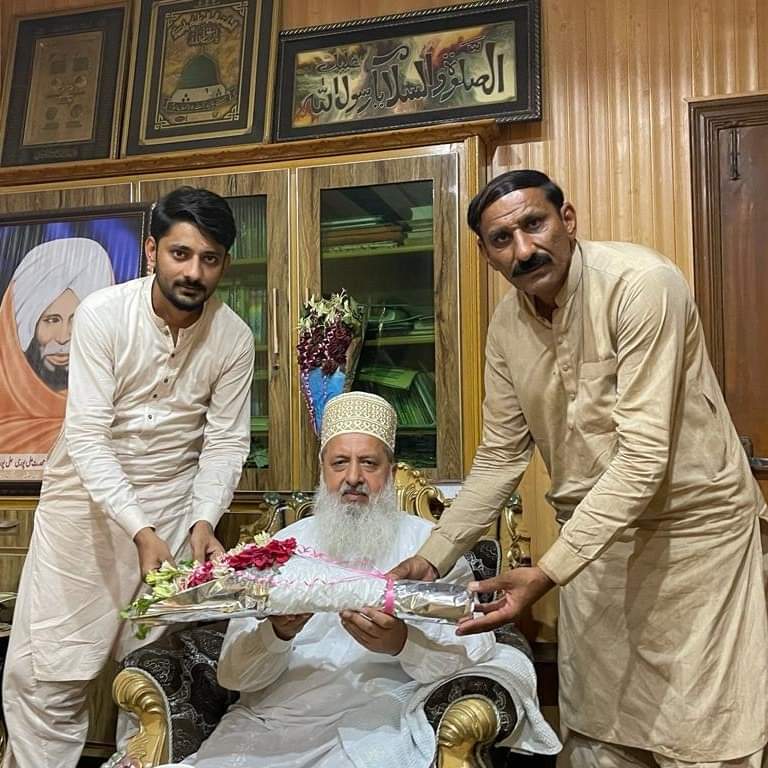 عارف والہ سے آئے ہوئے پیر بھائی محمد سادت جماعتی صاحب اور محمد علی شان جماعتی صاحب سجادہ نشین حضرت امیر ملت پیر سید منور حسین شاہ جماعتی صاحب سے ملاقات کرتے ہوئے